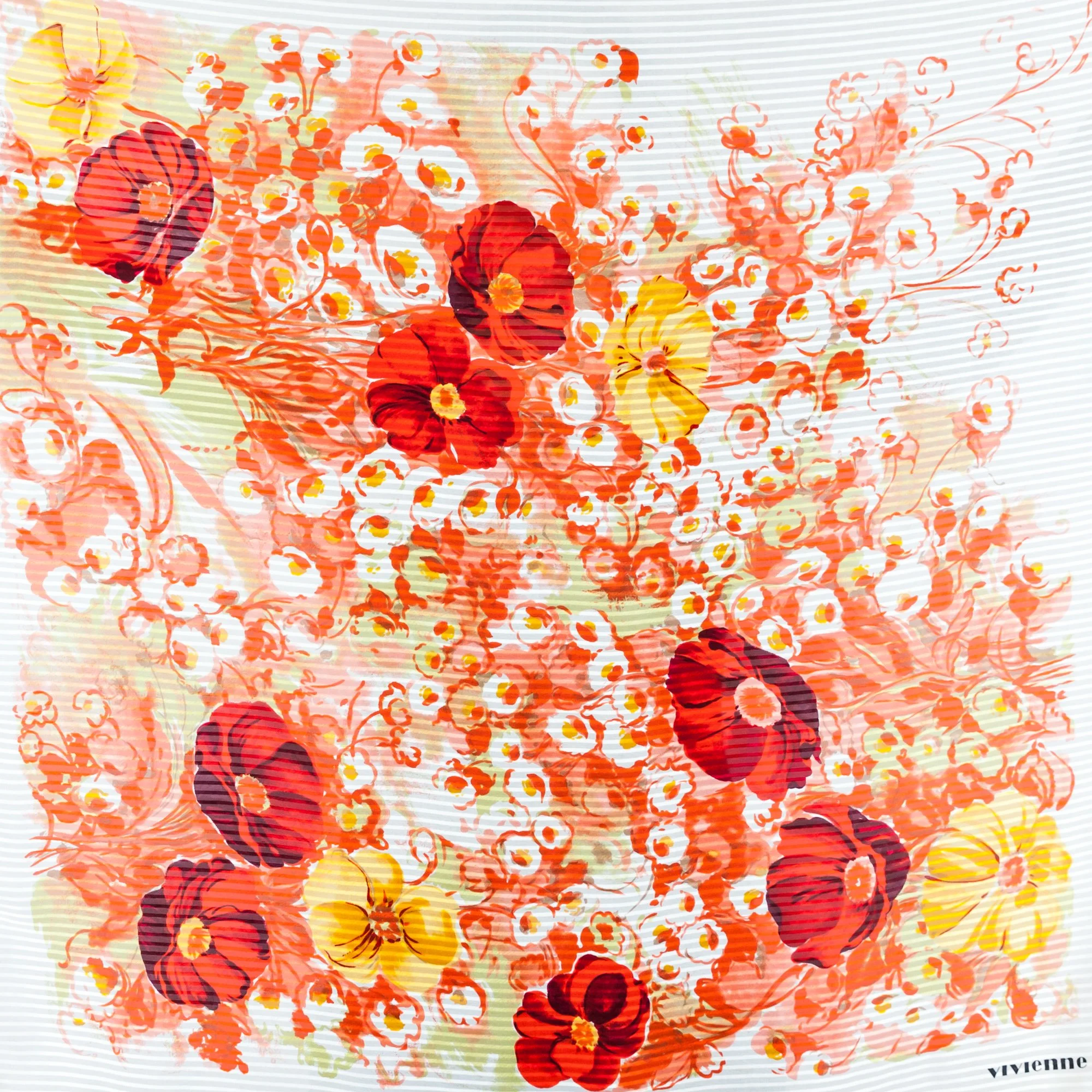 foulard, Italy Enrico Valenti 7/10/25 foulard, Italy Enrico Valenti 7/10/25 Vivienne floral silk scarf 70s floral motif in red and yellow tones Read More